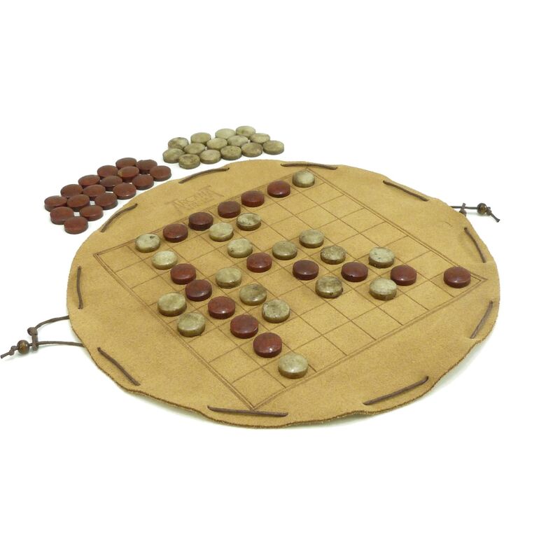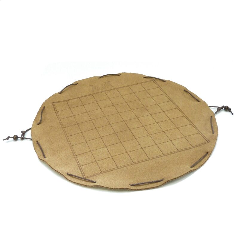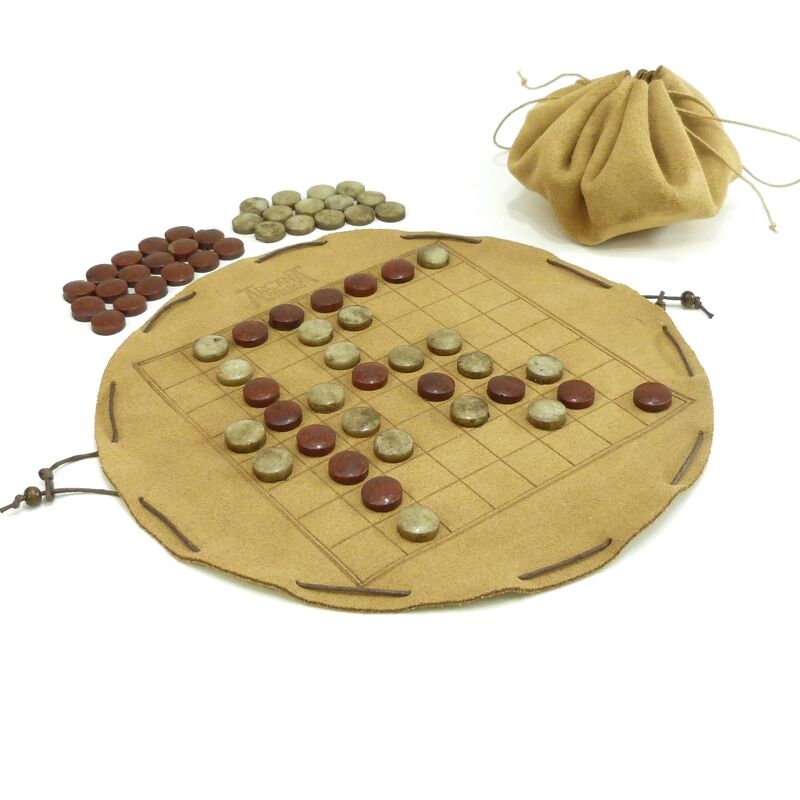 Tablero en piel de ternera pirograbada a mano con fichas elaboradas en resina con polvo de mármol (muy resistentes). El tablero se pliega sobre sí mismo siendo la propia bolsa de transporte, quedándose todas las fichas en su interior.