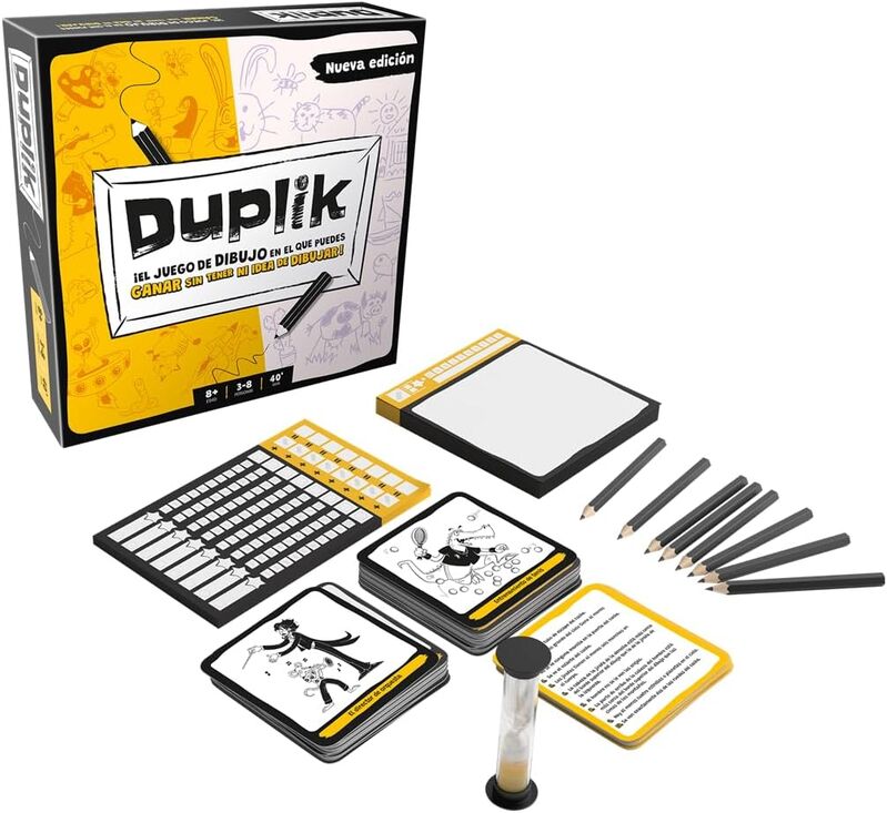 Nulos del arte pictórico, negados del lápiz y manazas varios, la victoria será vuestra!Vuelve Identik, bajo un nuevo formato: Duplik, el juego de dibujo para la gente que no sabe dibujar.Uno de los participantes desempeña el papel del director. Su objetivo: describir una ilustración ofreciendo a los demás jugadores tantos detalles como sea posible. Durante este tiempo, tus compañeros dibujarán la escena descrita. En cuanto se acabe el tiempo en el reloj de arena, los jugadores deberán intercambiar sus ''obras''. Cuantos más criterios de los mencionados en la tarjeta haya en tu dibujo, más puntos conseguirás. ¡No te pierdas este juego, donde hasta tu hermanita pequeña puede derrotarte!