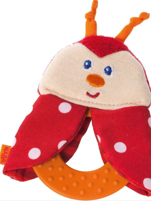 Esta alegre mariquita sirve de distracción para los niños a los que les están saliendo los dientes. La superficie texturizada del anillo ayuda a mover las mandíbulas y la divertida figura con su sonidos de las alas les invita a agarrarla.